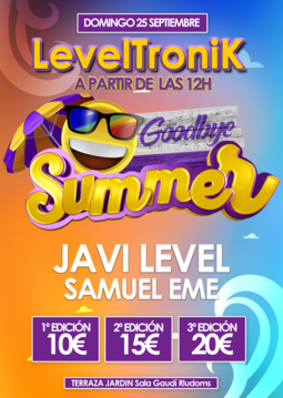 El domingo 25 de Septiembre diremos Goodbye al verano con otro gran festival en familia compartiendo sol, bailes y sonrisas al ritmo del mejor sonido level de todos los tiempos fusionado con el techno más actual de la mano de JAVI LEVEL y SAMUEL EME.